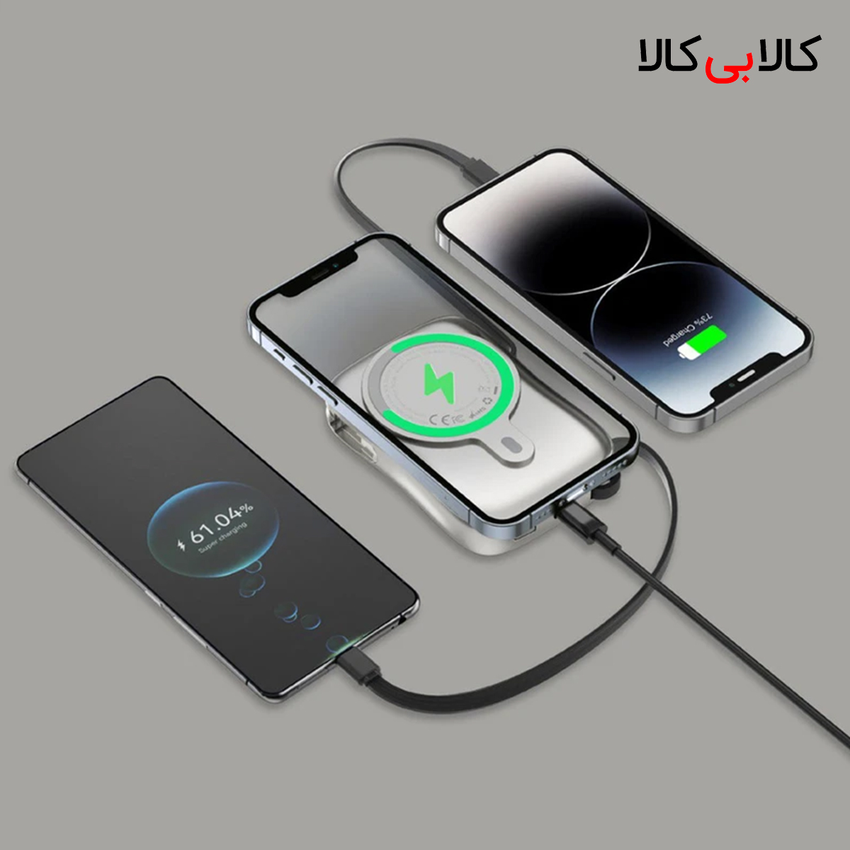 این پاوربانک به پد وایرلس، کابل Lightning، کابل Type-C و پورت Type-C مشترک مجهز است و امکان شارژ همزمان چند دستگاه را بدون نیاز به کابل اضافه فراهم میکند. بدنه پلاستیکی باکیفیت آن در برابر ضربه و فشار مقاومت مناسبی دارد. نمایشگر دیجیتال درصدی نیز میزان شارژ باقیمانده را بهصورت دقیق نشان میدهد.