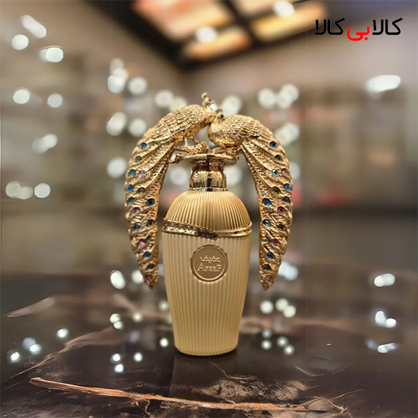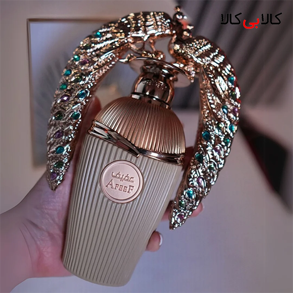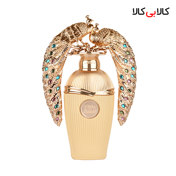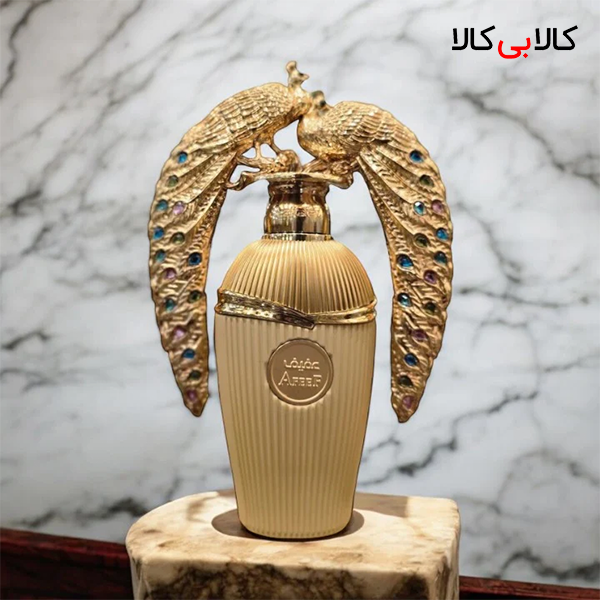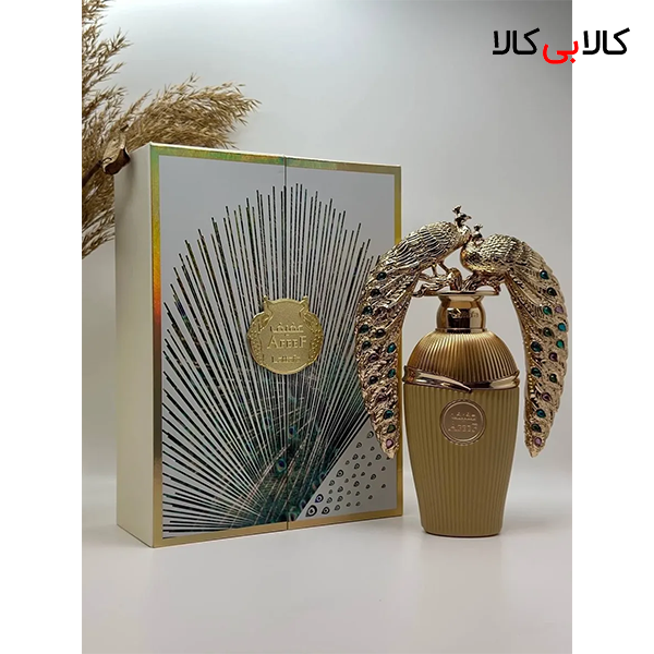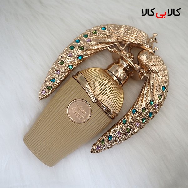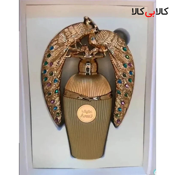 شیشهی ادکلن عفیف بیشک یکی از هنرمندانهترین و لوکسترین طراحیها را دارد. در نگاه اول، توجه شما را به دو طاووس طلایی مجلل جلب میکند که به شکلی باشکوه و متقارن در قسمت بالای شیشه ایستادهاند. این طاووسها با نگینهای رنگارنگ و درخشان تزئین شدهاند، که نمادی از زیبایی، شکوه، وقار و اصالت شرقی هستند.