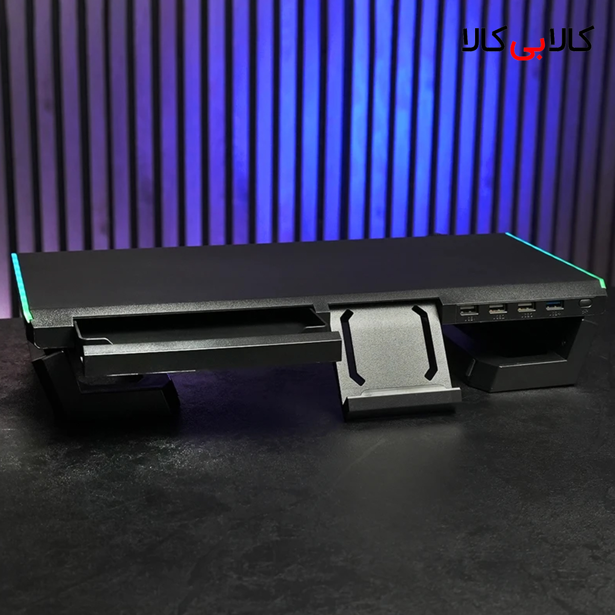 این پایه مانیتور فراتر از یک استند ساده عمل میکند و امکانات کاربردی متعددی را ارائه میدهد. نورپردازی RGB با 10 حالت قابل تنظیم جلوهای مدرن و هماهنگ با ستاپ گیمینگ یا محیط کاری ایجاد میکند. وجود 4 پورت USB شامل یک USB 3.0 و سه USB 2.0 اتصال سریع تجهیزات جانبی مانند ماوس و فلشمموری را ممکن میسازد و کابل USB همراه نیز استفاده را آسانتر میکند.